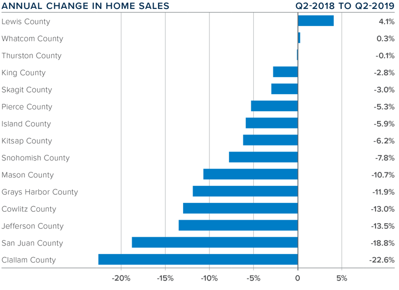 - Compared to the second quarter of 2018, there were fewer sales in all counties except Whatcom and Lewis. The greatest declines were in Clallam, San Juan, and Jefferson counties.