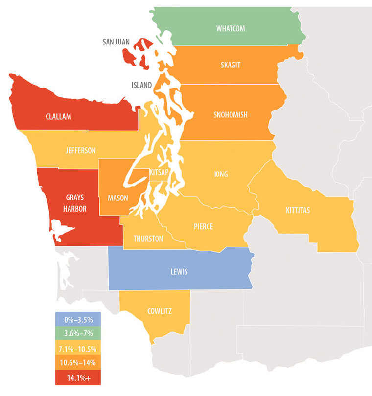 - Island County saw sales grow at the fastest rate over the past 12 months, with sales up by 22.1%. This is a small county which is subject to wild swings, so I take the data at face value. That said, the larger Thurston County saw sales up by an equally impressive 19.7%. Most interesting is that King County saw sales fall modestly compared to the same time period in 2015. Price—and supply—are clearly an issue in the most populous county in our state.