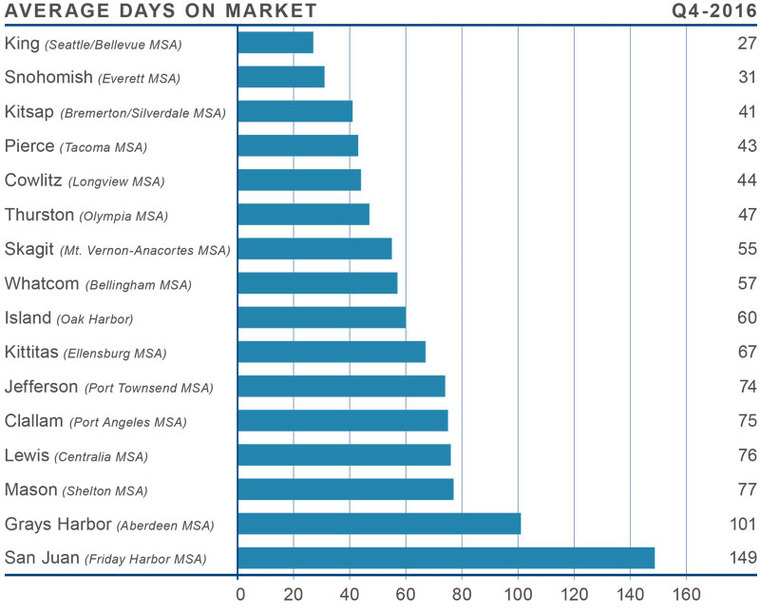 - King County was the only area where it took less than a month to sell a home, but all markets saw decent improvement in the time it took to sell a home when compared to a year ago.