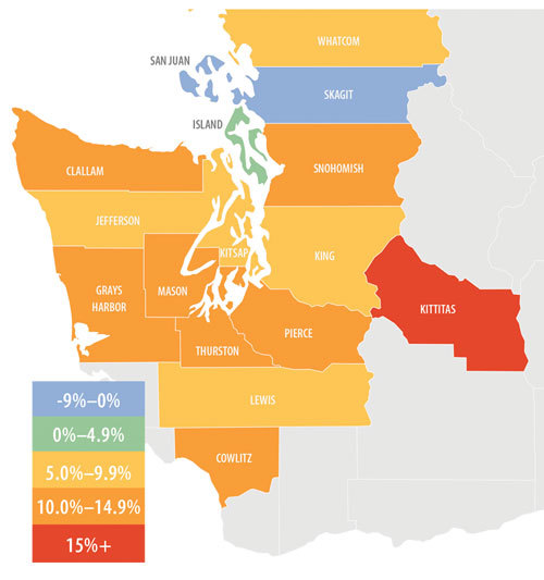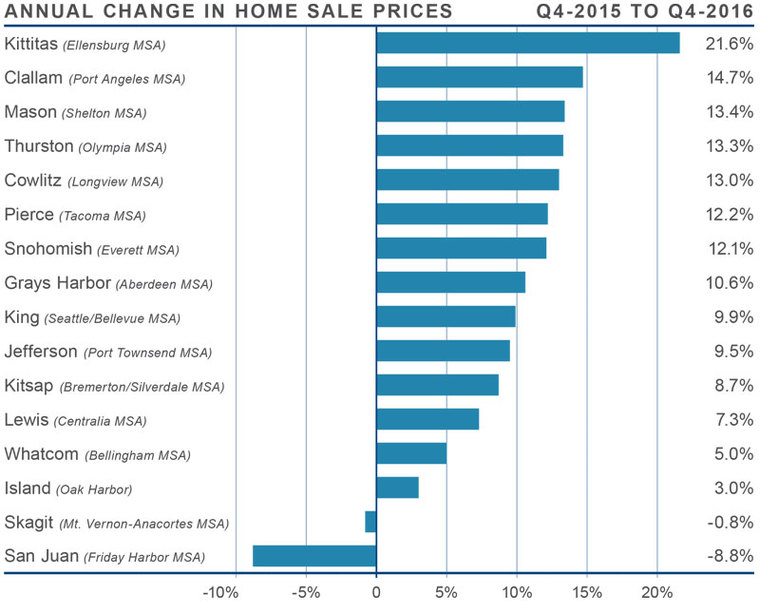 - When compared to the fourth quarter of 2015, price growth was most pronounced in Kittitas County. In total, there were eight counties where annual price growth exceeded 10%. We saw a drop in sales prices in the notoriously volatile San Juan County.