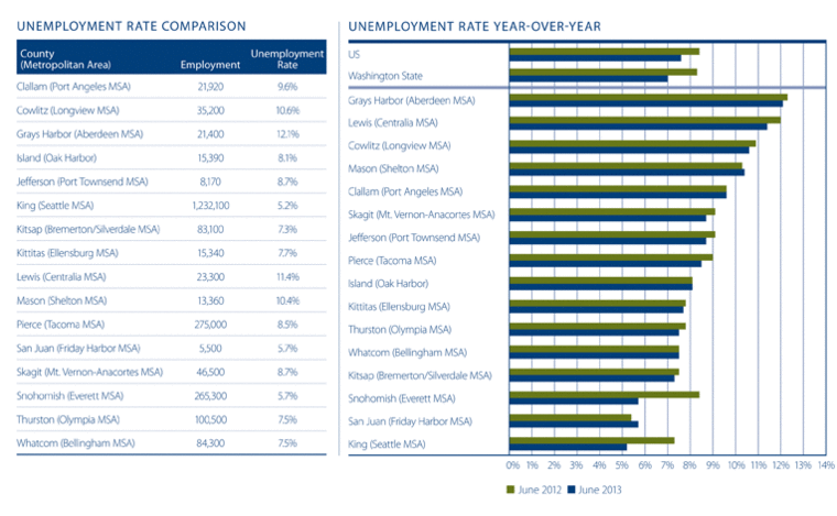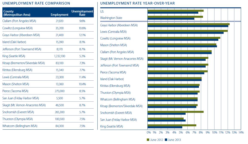 As mentioned previously, job losses were generally modest, with San Juan (-5.8%), Cowlitz (-2.8%) Grays Harbor (-2.4%), and Clallam (-2.0%) Counties suffering the greatest percentage losses. In aggregate, the areas that saw a reduction in employment lost a total of 2,460 jobs. We would note, however, that no counties saw losses between the end of the first quarter and the end of the second quarter of this year.