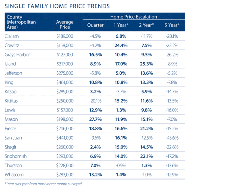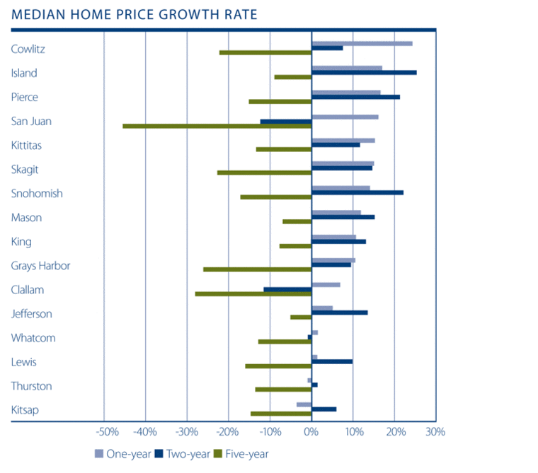 Of the counties that saw appreciation, the most pronounced gains were in Cowlitz County, where prices rose by 24.4 percent. Significant additional gains were seen in Island (+17%), Pierce (+16.6%), San Juan (+16.1%), Kittitas (+15.2%), and Skagit (+15%) Counties. Declines were limited to Kitsap (-3.7%) and Thurston (-0.9%) Counties.