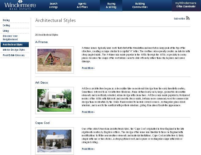 You may also notice some new sections on Windermere.com. We have included new Architectural Style & Interior Design Style sections under the Buying & Selling tab. This information may aid in your search process by helping you identify architectural and design styles you like.