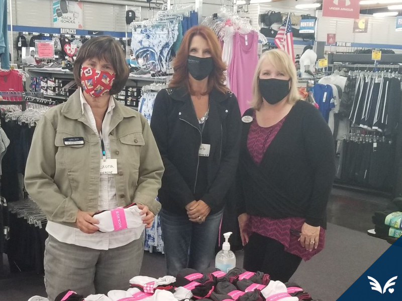 Pictured L to R: Laura Zahn, Barb Pielli, and Wendy Shiley handing out socks at the Spokane Big 5 Sporting Goods