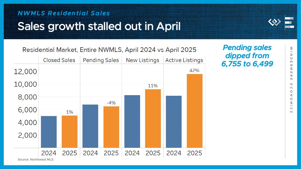 Across the Northwest MLS, closed sales of single-family homes grew just 1% in April from their year-ago levels, after growing 5% in March. Pending sales, which are more of a real-time demand indicator, dipped 4% from last year, a disappointing reversal after climbing 7% in March.