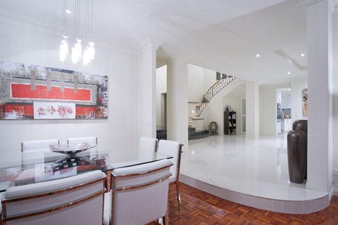 Art Deco style is a decorative take on modernist style from the early twentieth century. Interior architectural elements include smooth walls with rounded corners, parquet wood floors, glass block windows, and porthole windows. Furniture is modern, often with mirrored facades, and is heavily lacquered or with inlaid geometric designs. Common materials also include veneer, stainless steel, or chrome. As with modernist style, spaces are uncluttered with minimal furniture or display.